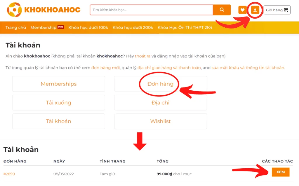 • Vào Tài Khoản chọn mục Đơn Hàng để nhận khóa học