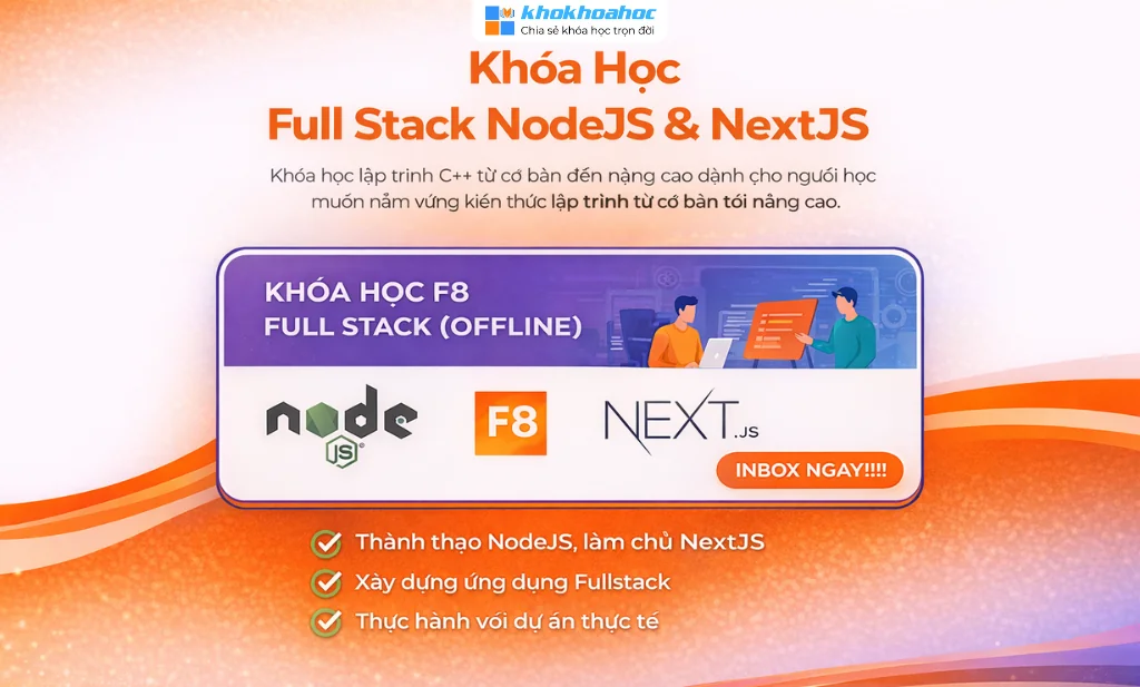 Bạn đang tìm kiếm một khóa học fullstack f8 giúp bạn làm chủ NodeJS và NextJS, hai công nghệ dẫn đầu trong lĩnh vực phát triển web hiện đại? Khóa Học Fullstack F8 NodeJS và NextJS Khóa Offline chính là lựa chọn hoàn hảo dành cho bạn – được xây dựng bởi đội ngũ chuyên gia hàng đầu, mang đến lộ trình bài bản, thực tế và tối ưu cho người theo đuổi nghề lập trình.