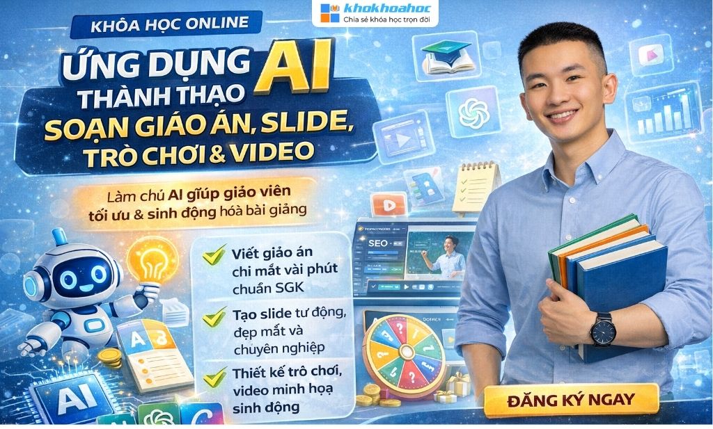 Share Khóa Học Ứng Dụng AI Thành Thạo Soạn Giáo Án, Slide, Trò Chơi, Video được thiết kế theo hướng cầm tay chỉ việc, giúp giáo viên ở mọi cấp học ứng dụng AI một cách bài bản và hiệu quả vào toàn bộ quy trình dạy học.